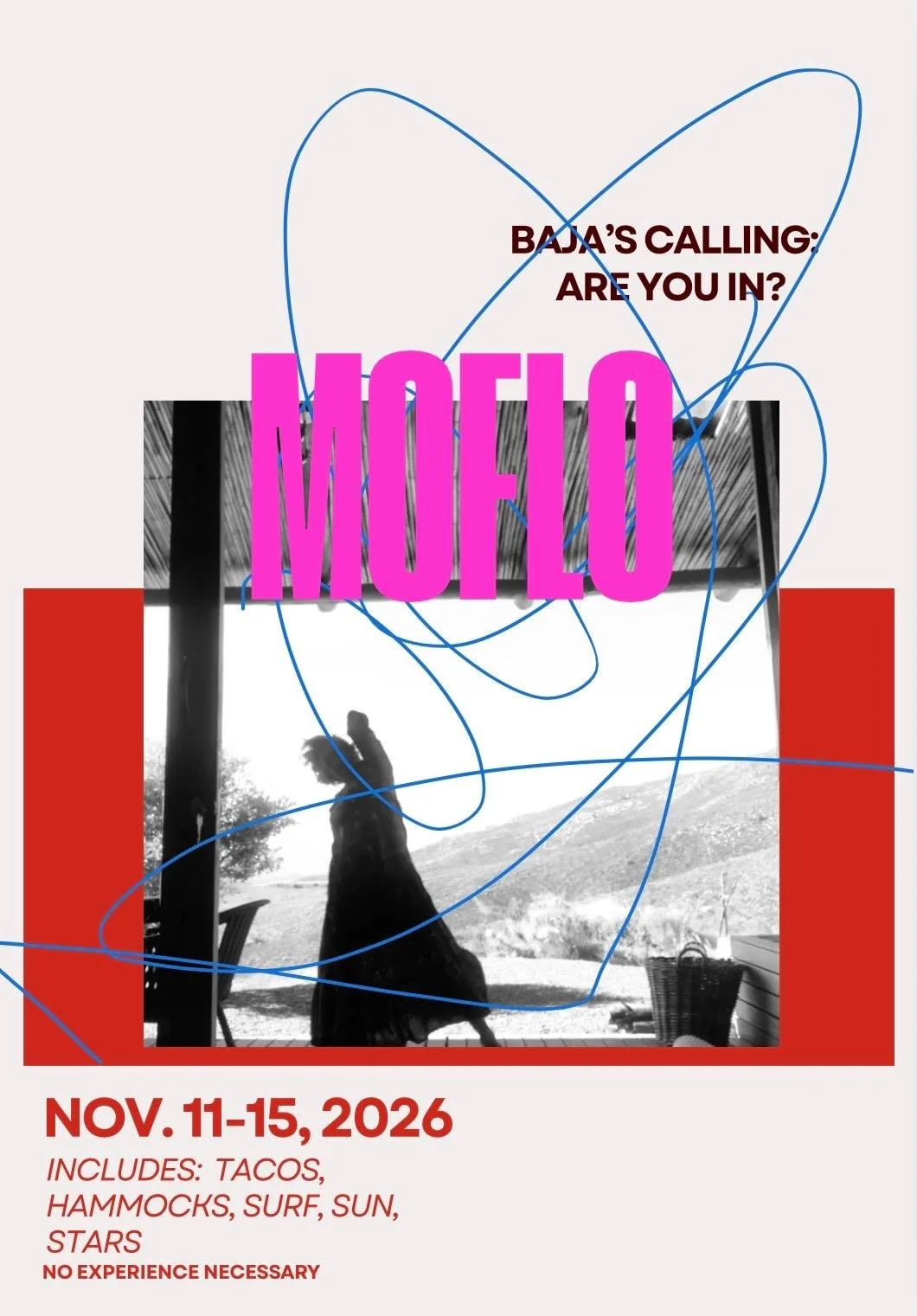 November 11-15, 2026 Move, surf, eat, nap, and play — twice daily MoFlo sessions, surf/sunbathe at Cerritos Beach, a trip to Todos Santos, long meals, walks, & a few other little adventures, with plenty of Siesta.